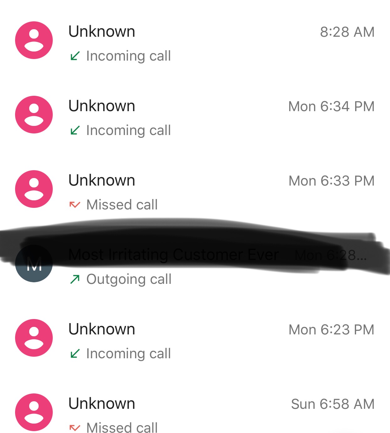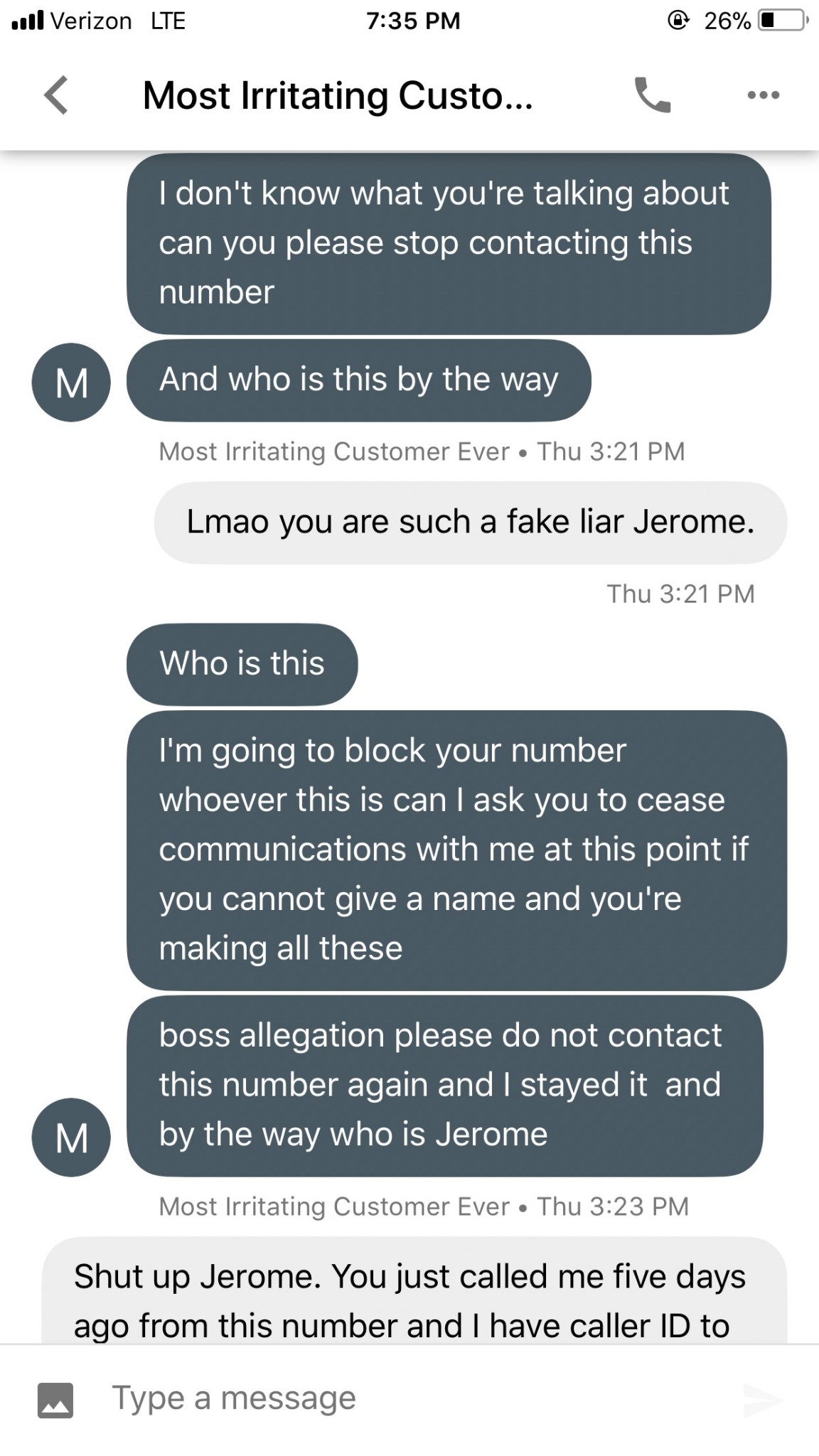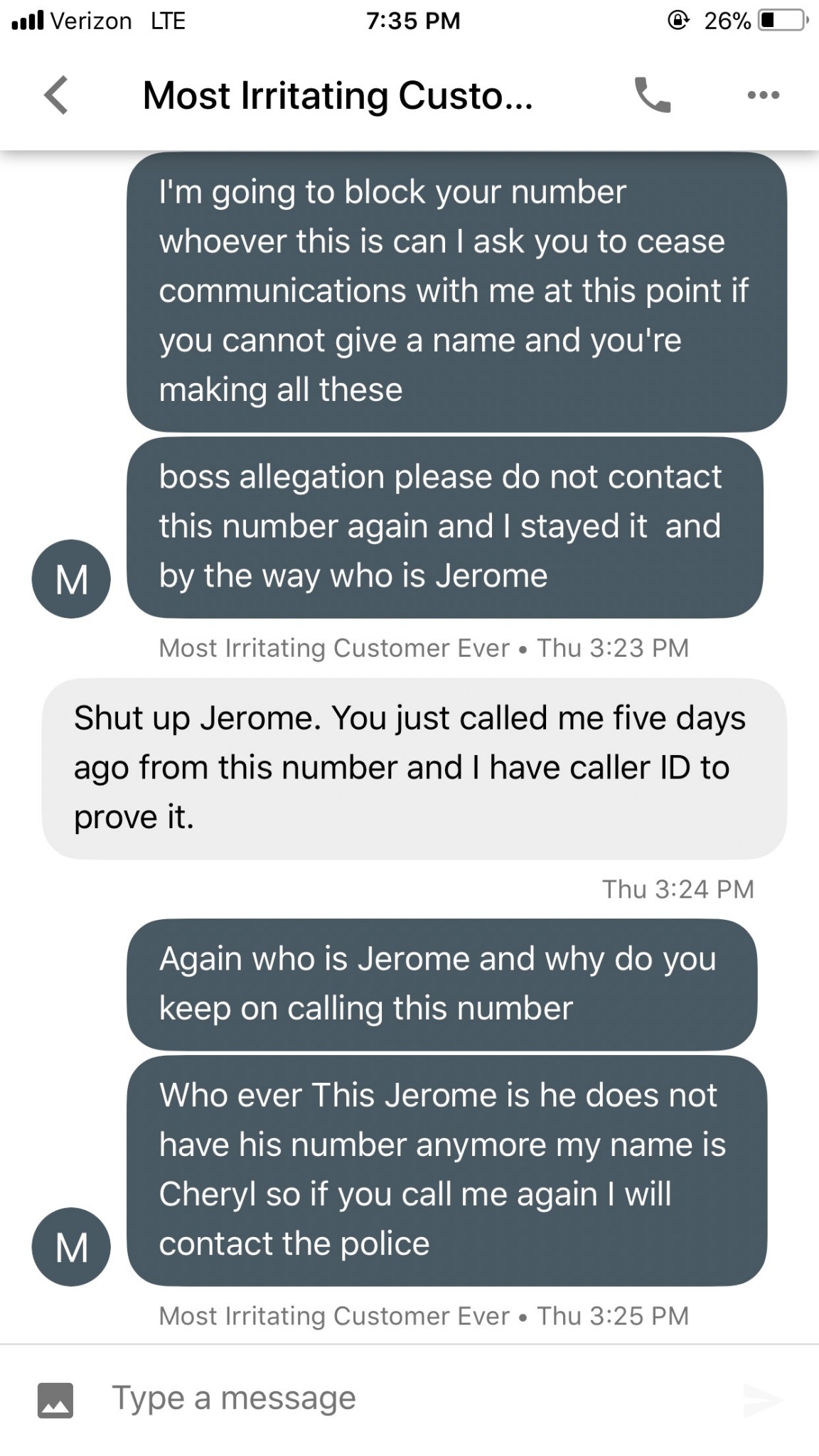 Shown above are the many phone calls we received from Jerome Nisbett attempting to block his phone number. Furthermore, confrontational text messages saw Jerome pretend to be a woman named Cheryl. His addresses; phone numbers, and all have been turned over to the appropriate authorities.