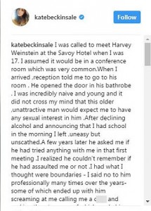 Yes people what you’re about to read is very real.  Brit actress Kate Beckinsale has come forth with her own harrowing story on Weinstein and it isn’t pretty.  Beckinsale, per reports,  has come forth noting that at the age of 17 she was “also sexually assaulted in a hotel room in an almost similar manner to others.  She dodged his attempts and never spoke much to him again. Years later, “he did ask me if he had did anything to me that night in the hotel room. It was like he couldn’t remember if he had sexually assaulted me”.