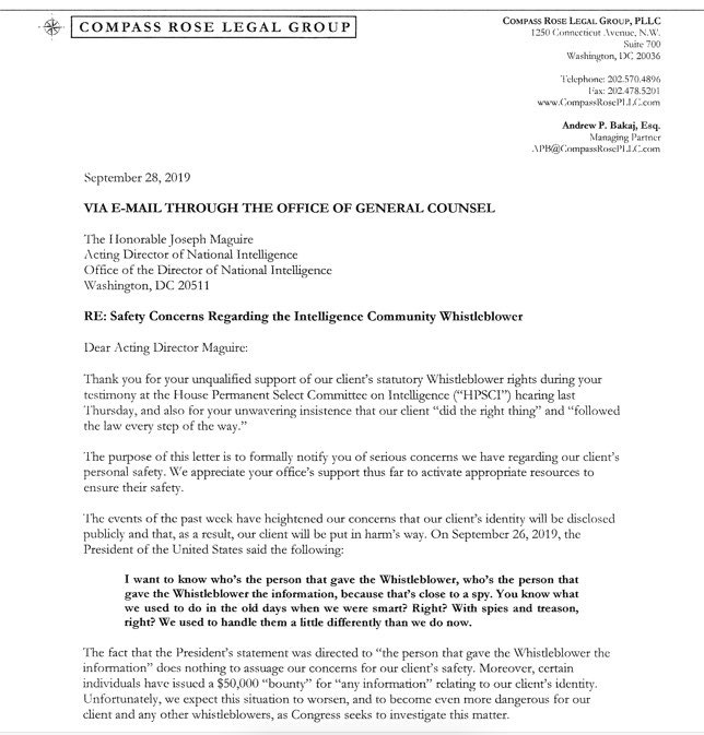 The war over the whistleblower who appears to be poised to help remove Trump from office rages on. On Monday, the following letters from their reported law firm were made available online.