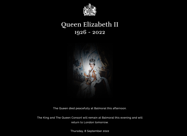 “The Queen died peacefully at Balmoral this afternoon,” the statement read. “The King and The Queen Consort will remain at Balmoral this evening and will return to London tomorrow.”