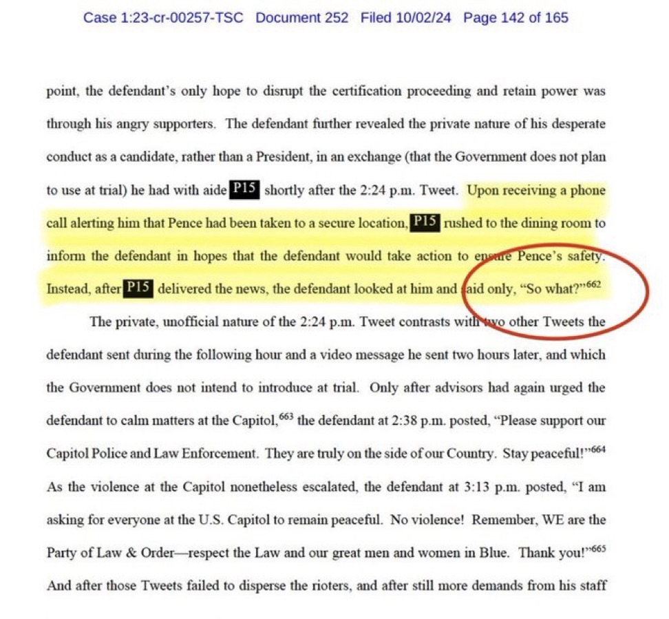 Elsewhere in the document, prosecutors revealed one instance with Pence that has long set off alarm bells among critics. During the J6 insurrection on the Capitol, Pence was notably in danger after those who stormed the Capitol had threatened to hang him. Trump ‘s response according to the filing reads as ‘Who cares.’