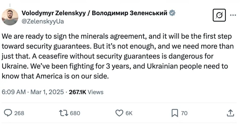 “We are ready to sign the minerals agreement, and it will be the first step toward security guarantees,” Zelensky said in a statement on social media on Saturday. “But it’s not enough, and we need more than just that. A ceasefire without security guarantees is dangerous for Ukraine. We’ve been fighting for three years, and Ukrainian people need to know that America is on our side.